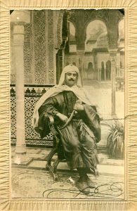 Olegario Verdú vestido a la manera árabe en un viaje comercial a las colonias en el norte de África. Sin embargo, los extremos del bigote apuntan ligeramente hacia arriba conforme a la moda inglesa del momento.