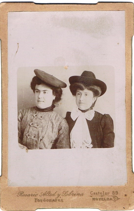 Y, por último, Rosario Alted y Sobrina, de Novelda, vinculadas familiarmente a los Belda, son el caso más emprendedor de dos mujeres fotógrafas establecidas en nuestras tierras y de las que ha quedado muy pocas huellas de su trabajo que pensamos, fue bastante efímero.