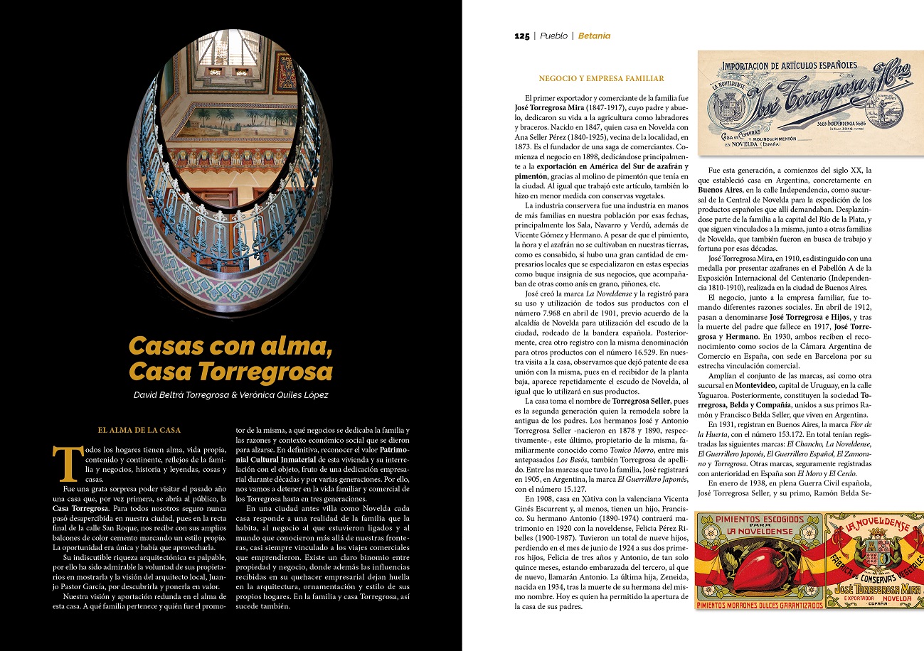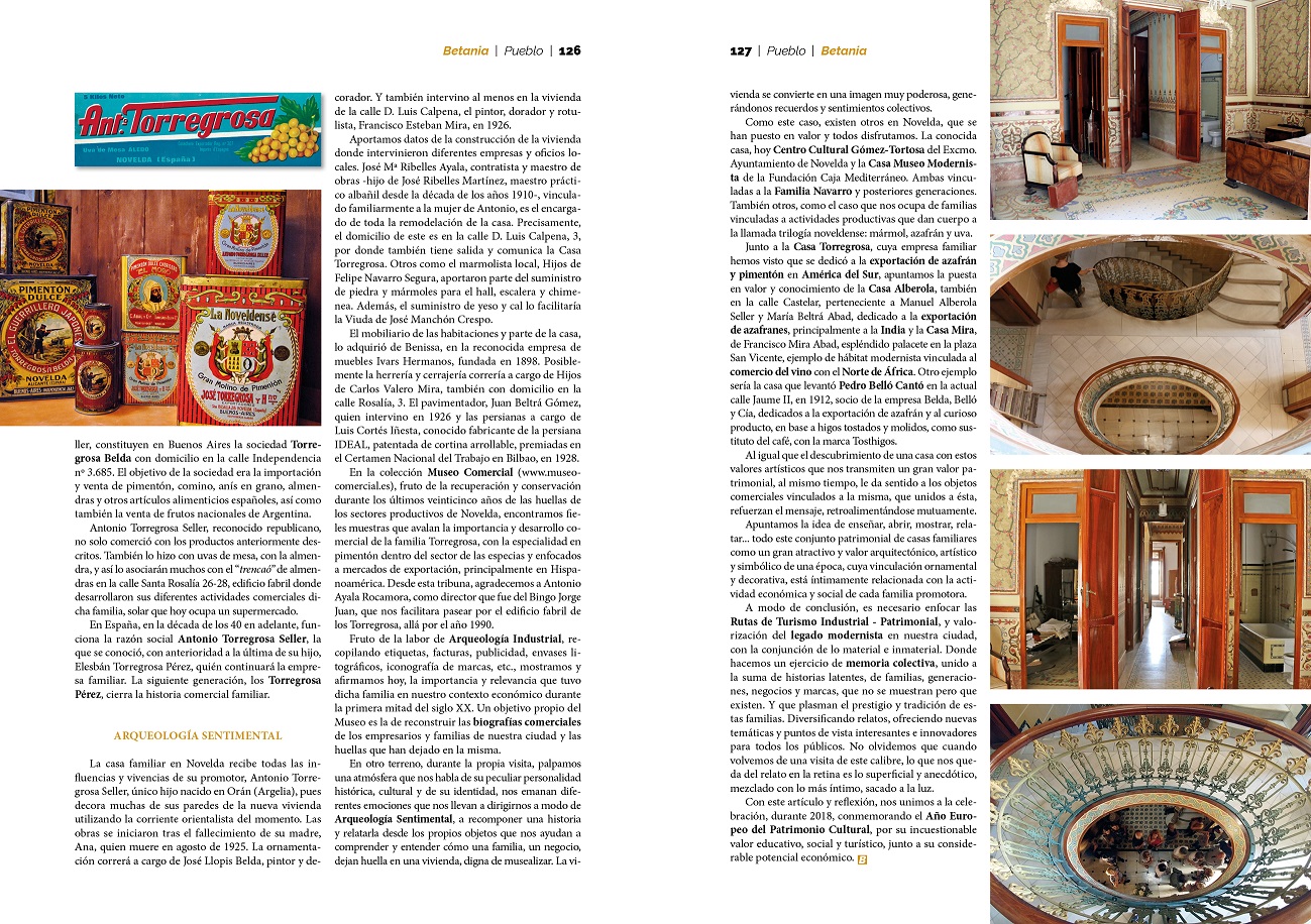 En la colección, Museo Comercial (www.museocomercial.com) fruto de la recuperación y conservación durante los últimos veinticinco años de las huellas de los sectores productivos de Novelda, encontramos fieles muestras que avalan la importancia y desarrollo comercial de la familia Torregrosa, con la especialidad en pimentón dentro del sector de las especias y enfocados a mercados de exportación, principalmente en Hispanoamérica. Desde esta tribuna, agradecemos a Antonio Ayala Rocamora, como jefe de sala del Bingo Jorge Juan, que nos facilitara pasear por el edificio fabril de los Torregrosa, allá por el año 1990.