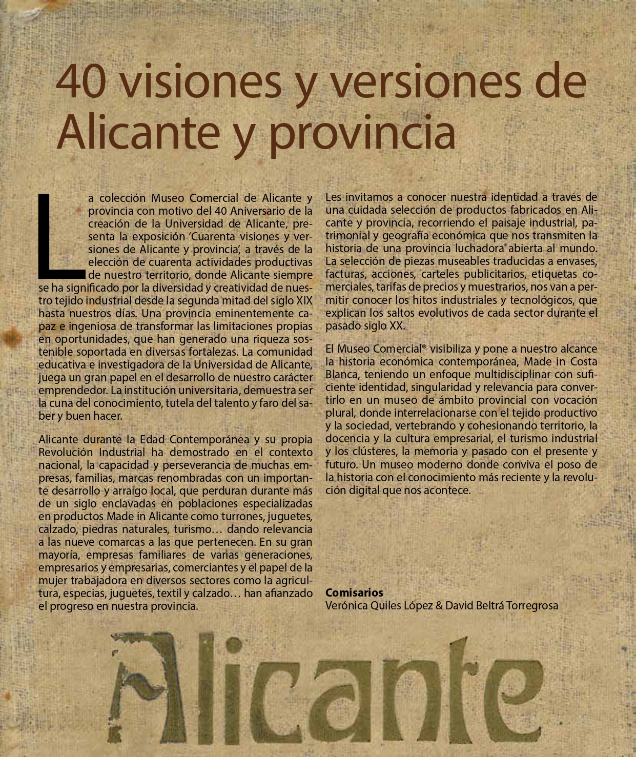 Quiles López, V. y Beltrá Torregrosa, D. (2019). Cuarenta visiones y versiones de Alicante y provincia. Catálogo Exposición Universidad de Alicante. Edita Museo Comercial y AEFA, Asociación de la Empresa Familiar de Alicante, 36 pp.