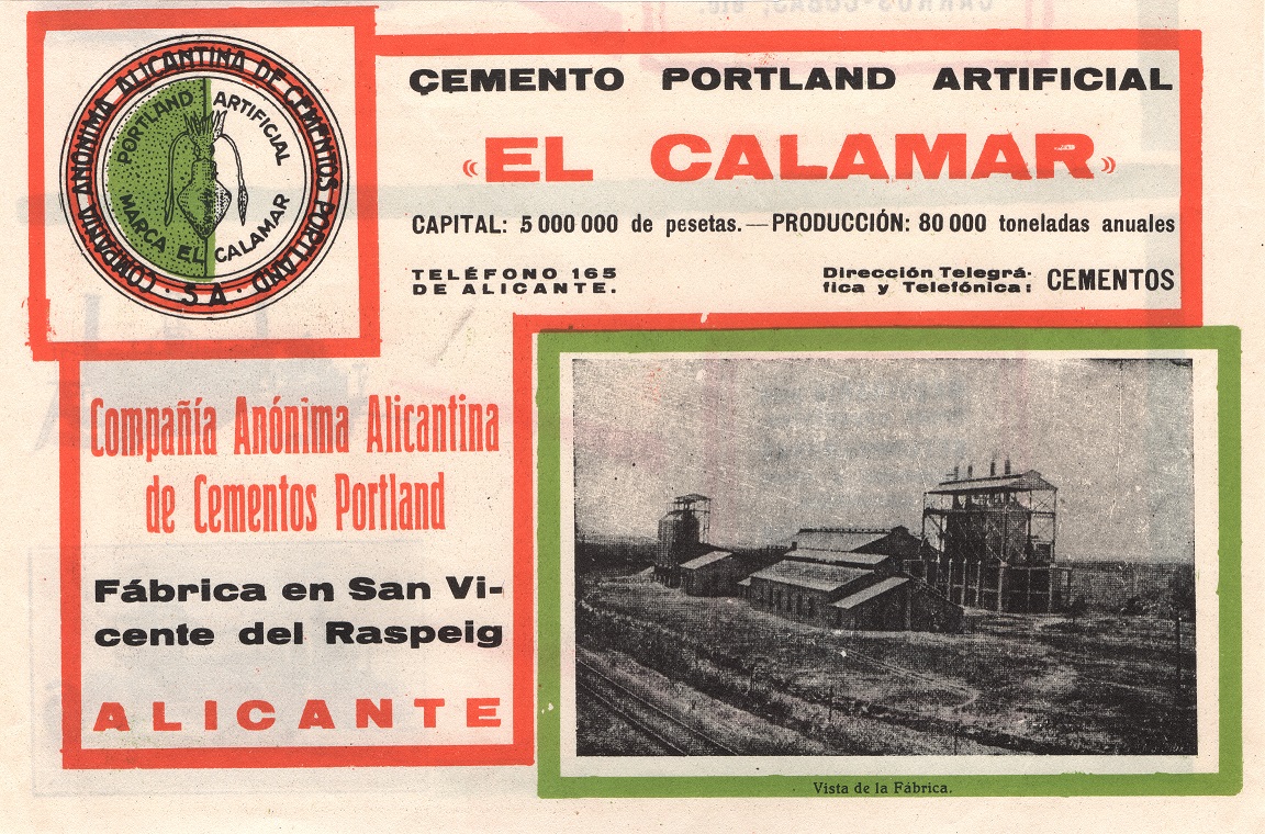 La Compañía Anónima Alicantina de Cementos Portland, con fábrica en San Vicente del Raspeig, establecida en la década de 1920, con capital de cinco millones de pesetas, llegó a producir unas 80.000 toneladas anuales de diferentes tipos de cementos, blanco y gris, bajo su marca El Calamar.