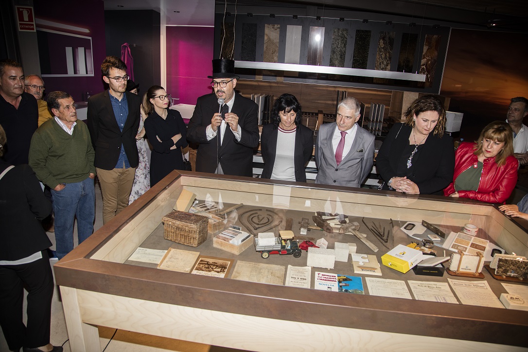 Paco Castelló de Bateig, Luis Navarro de MarmolSpain, Fran Martínez (concejal PSOE), Silvia Anna (concejal Compromís), David Beltrá, Encarni Abad de Asociación Mármol de Alicante, Armado Esteve, alcalde de Novelda, Hortensia Pérez (concejal Partido Popular) y Cari Crespo (Concejal UPyD), inaugurando la vitrina relativa al mármol y piedra natural. Foto Ramiro