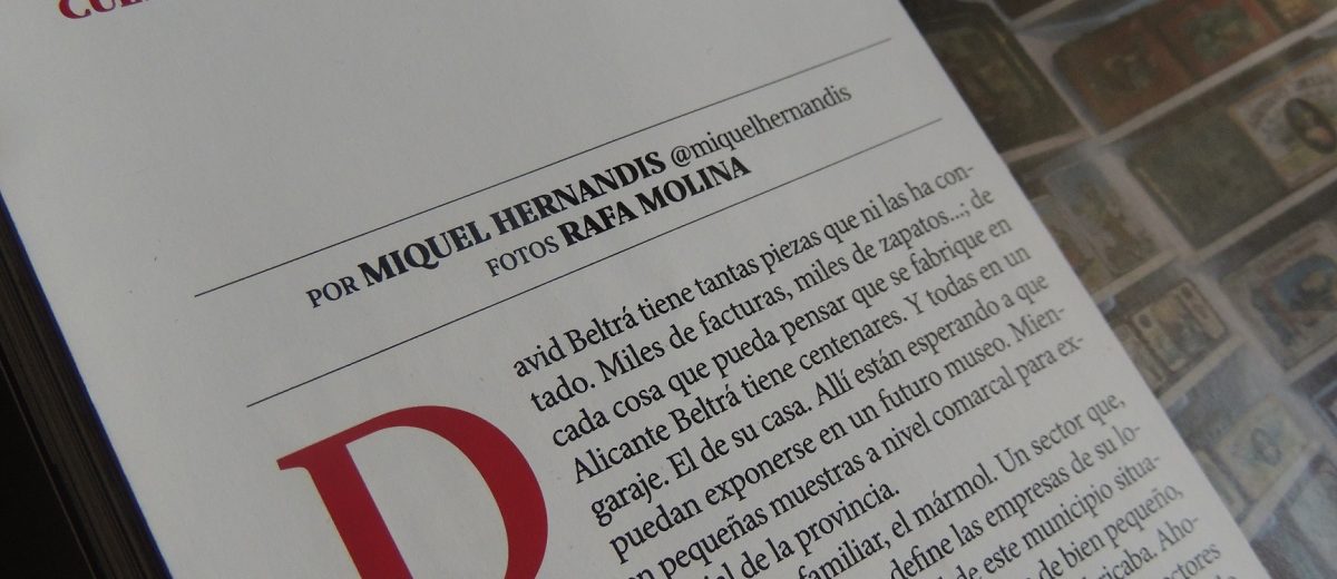 David Beltrá tiene tantas piezas que ni las ha contado. Miles de facturas, miles de zapatos…; de cada cosa que pueda pensar que se fabrique en Alicante Beltrá tiene centenares. Y todas en un garaje. El de su casa. Allí están esperando a que puedan exponerse en un futuro museo. Mientras, van saliendo en pequeñas muestras a nivel comarcal para explicar el pasado industrial de la provincia.