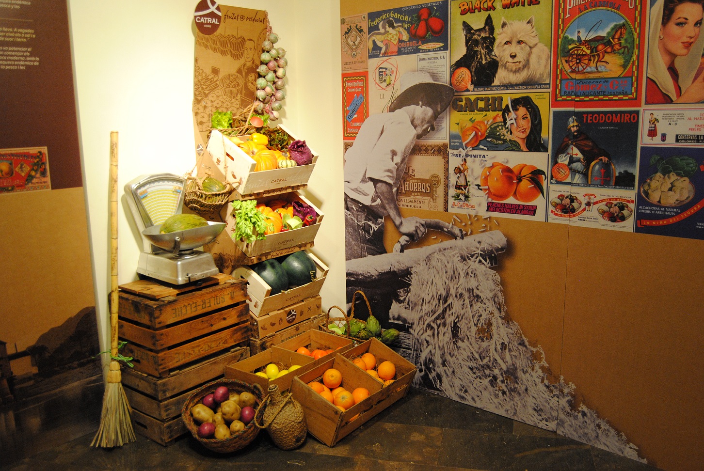 El cronograma nos ayuda a comprender los hitos históricos en todos los ámbitos, social, político, económico, cultural… desde 1858 hasta nuestros días. Hemos representado el turismo haciendo un guiño sobre el hall de entrada de un antiguo hotel o fonda con un sencillo mobiliario evocador de otra época y utilizando un recurso tan frágil como efímero utilizando los banderines con los que todos los turistas regresaban del viaje con su recuerdo. Hemos aderezado con piezas de mayor volumen como la balanza, oriunda de Orihuela, que pesó muchos melones de estos campos que viajaron al norte de Europa. Y el puesto de verduras y hortalizas, facilitado por la empresa Catral Garden, que ya se acerca a las empresas familiares centenarias. Gracias Fernando Martín por tu amabilidad y generosidad.