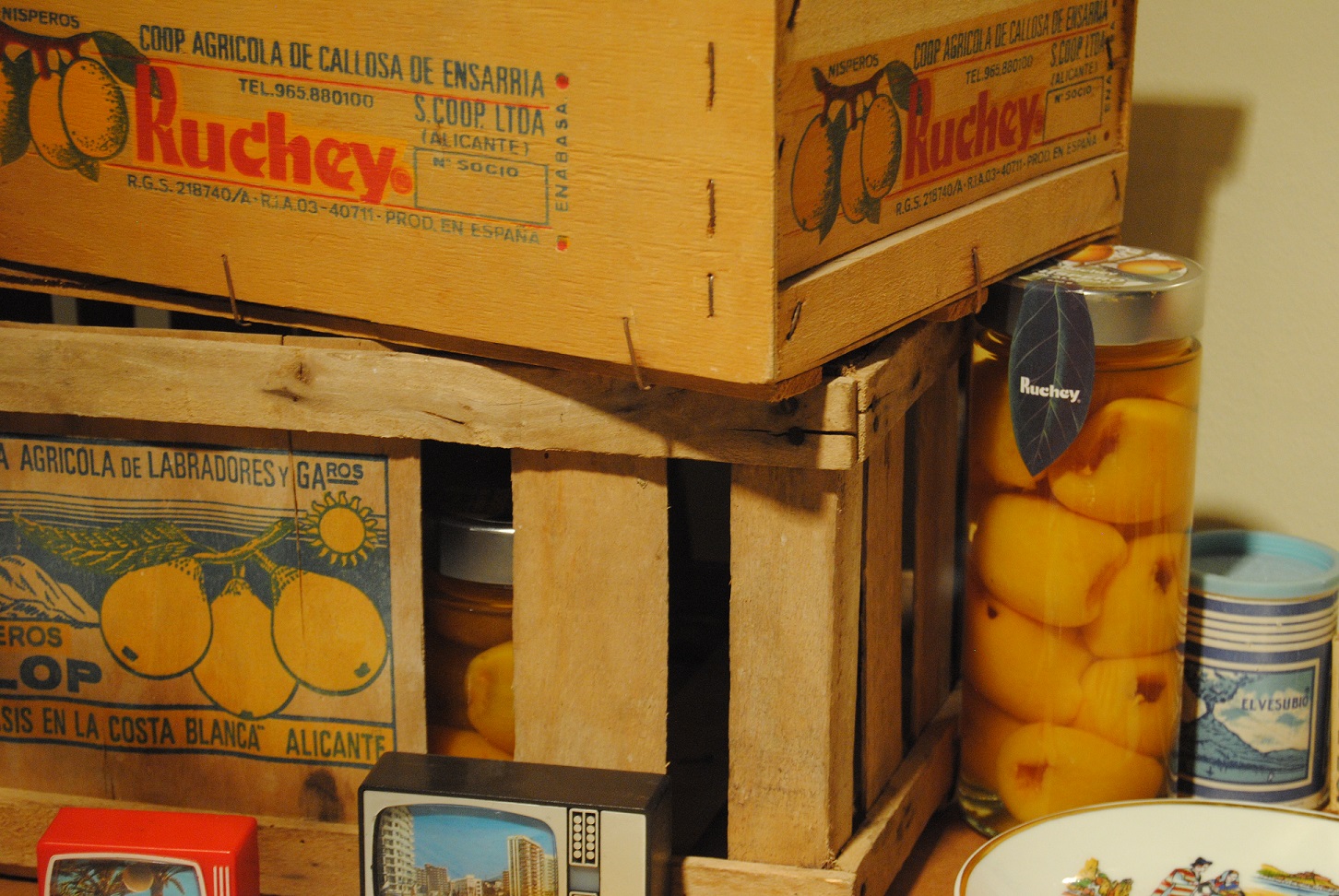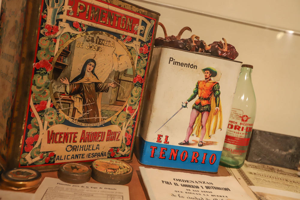 Sin olvidar el resto de productos que representamos de esta ciudad como el pimentón de la Vega de Orihuela y sus cincos molinos, la gran Fábrica de Seda que recuperamos con una pequeña cajita de muestras, el proyecto de la compañía Oriolana de cementos, el insecticida Ori-ol así como la representación de una fábrica de sal y chocolates y un elenco de históricas etiquetas hortofrutícolas con tanto presente y futuro. Así como una acción de la Caja de Ahorros de Orihuela fundada en 1880 y unas Ordenanzas para el gobierno y distribución de las aguas que riegan esta huerta, datadas en 1844, ahora que se persigue reconocer y estimar al Juzgado Privativo de Aguas de Orihuela como tribunal consuetudinario, equiparándolo al patrimonio inmaterial valenciano.