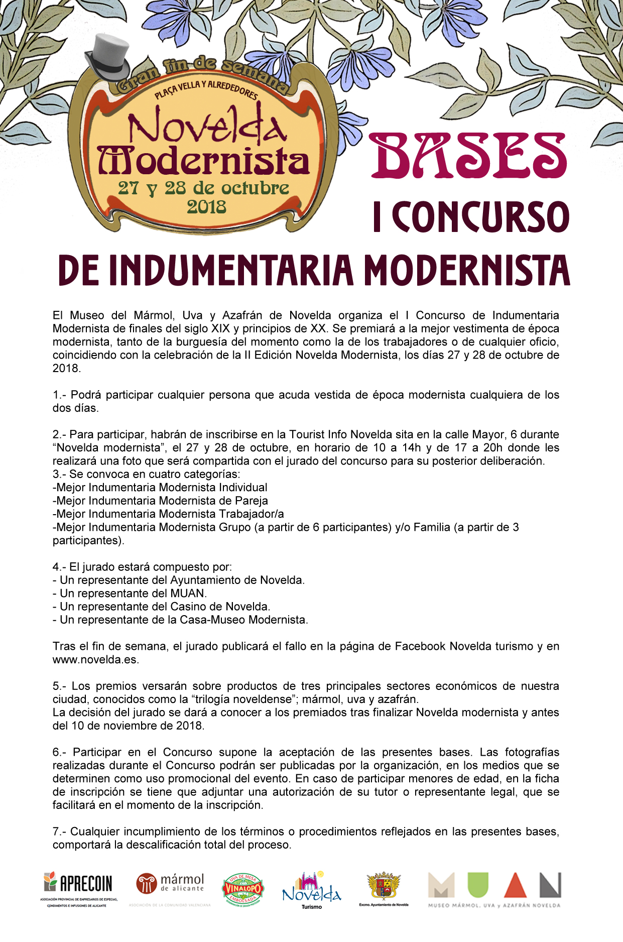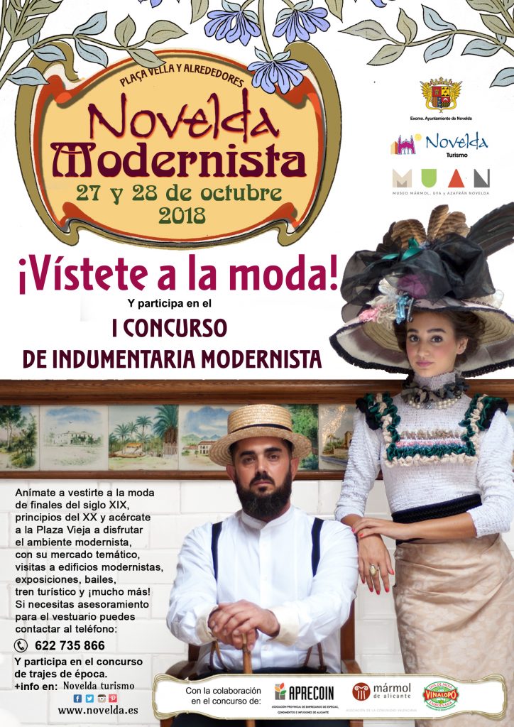 El Museo del Mármol, Uva y Azafrán de Novelda (MUAN) organiza el I Concurso de Indumentaria Modernista de finales del siglo XIX y principios de XX. Se premiará a la mejor vestimenta de época modernista, tanto de la burguesía del momento como la de los trabajadores o de cualquier oficio, coincidiendo con la celebración de la II Edición Novelda Modernista, los días 27 y 28 de octubre de 2018 que ha organizado el Ayuntamiento de Novelda.