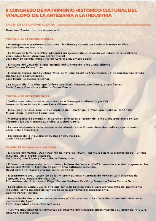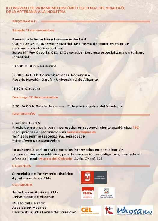 II Congreso sobre el Patrimonio histórico Cultural del Vinalopó: de la artesanía a la industria para valorar la riqueza del patrimonio vinculado a la industria en la comarca. El Ayuntamiento de Elda, desde la concejalía de Patrimonio Histórico y en colaboración con la Sede Universitaria de Elda de la Universidad de Alicante, ha organizado el II Congreso de Patrimonio histórico–cultural del Vinalopó.