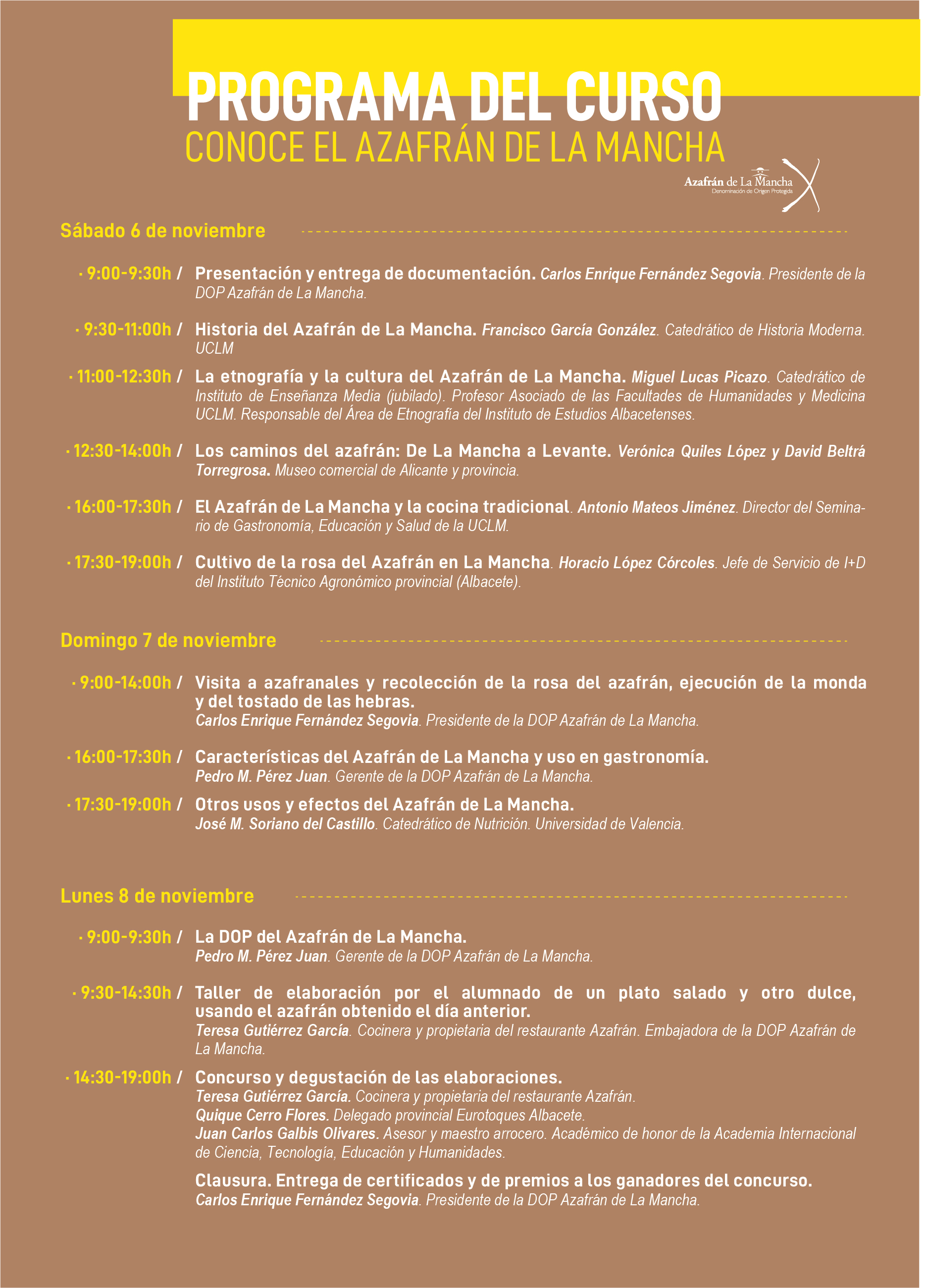 La mañana del domingo se dedicará a la visita a azafranales y recolección de la rosa del azafrán, ejecución de la monda y del tostado del azafrán, dirigida por el presidente de la DOP Azafrán de La Mancha. Por la tarde, el gerente de la Denominación de Origen, Pedro M. Pérez Juan, hablará sobre ‘Características del Azafrán de La Mancha y uso en gastronomía’ y el catedrático de Nutrición de la Universidad de Valencia, José M. Soriano del Castillo, sobre ‘Otros usos y efectos del Azafrán de La Mancha’.