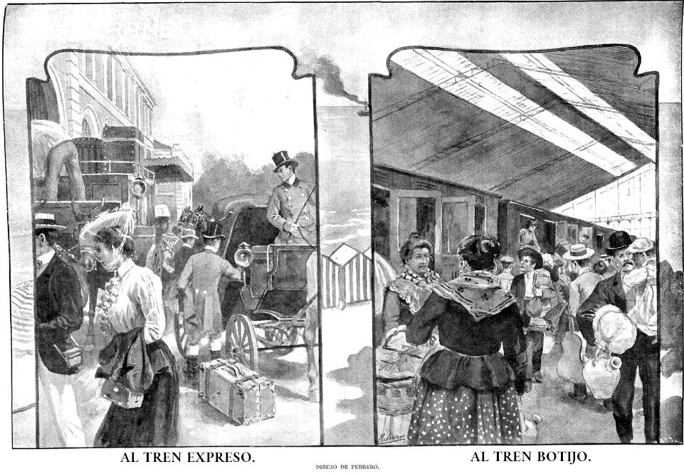 Pasajeros del tren Expreso y del tren Botijo. Dibujo de Pedrero. La Ilustración Española y Americana. 30 de julio 1902. Biblioteca Nacional España