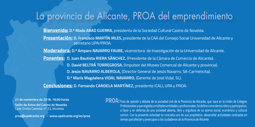 PROA, foro de Alicante os invita a la Mesa Redonda “La provincia de Alicante. PROA del emprendimiento”. Tendrá lugar el miércoles, 21 de noviembre de 2018, a las 19:00 horas, en el Salón de actos de la Sociedad Cultural Casino de Novelda.