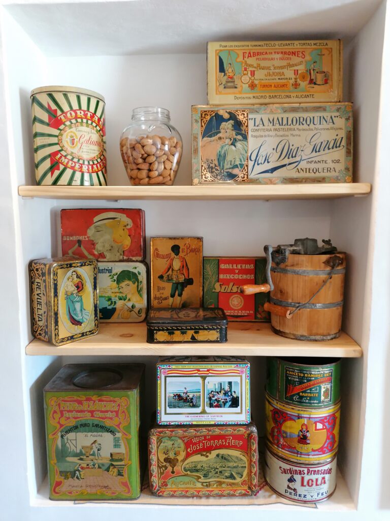 Por otro lado, no podía faltar la representación de diversos productos de Alicante o productos como el helado, representado con una heladera. En una de las alacenas se expuso diferentes cajas litográficas de la primera mitad del siglo XX, del preciado turrón de Jijona y Alicante, junto con las tortas. Le acompañan otras de chocolates, galletas, membrillos, bombones y las conservas de pescado, azafrán y pimentón. Destacamos dos cajas muy alicantinas como Dátiles Bernabé Bisosca, El Monagillo y coloniales de Viuda de José Torras, Alicante, con una espectacular imagen del puerto y Castillo de Alicante, todas, pertenecientes a nuestra colección.