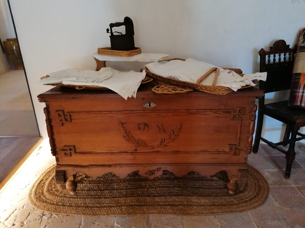 El primer eje, representado desde la perspectiva de género, para el caso de la mujer trabajadora, se realizó tres espacios: la zona destinada al lavado de ropa blanca con la exposición de un cocio, junto con las tablas de madera para el lavado y una piedra para el mismo fin que se dispuso junto al brocal del pozo. El segundo espacio fue el dedicado al planchado de ropa en un espacio creado bajo un aura femenino, donde se colocó una arca de finales del siglo XIX, y alrededor de la misma, la tabla de planchado, la plancha y las bandejas con ropa blanca doblada. El tercer espacio, también próximo al brocal del pozo, se ha colocado una pieza excepcional de nuestra colección, una cantarera alicantina realizada en madera para seis cántaros, vestidas con ellos y una jarrita.