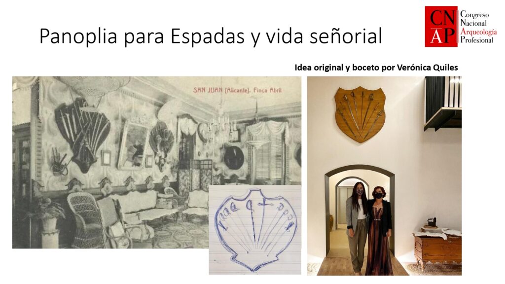 Era frecuente la exposición de las armas del propietario como elemento de prestigio y vinculación militar, además de la exhibición de los rangos oficiales, o pertenecientes al arte de la esgrima o armas de cacería. De las diez espadas decimonónicas, finalmente se escogieron ocho, cuyo trabajo para la confección de la panoplia se inspiró en imágenes de principios del siglo XX, correspondientes al salón de la finca Abril, de Sant Joan d’Alacant. La idea fue propuesta por nosotros y la ejecutó la ebanista Karen Jaruffe.