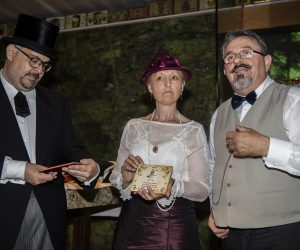 José Antonio Martínez entrega a los presidentes modernistas de Novelda (David) y Alcoy (Victoria) el azulejo con logotipo de los Modernistas Cartagena de Levante. Foto Ramiro