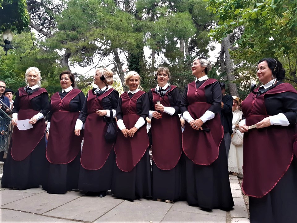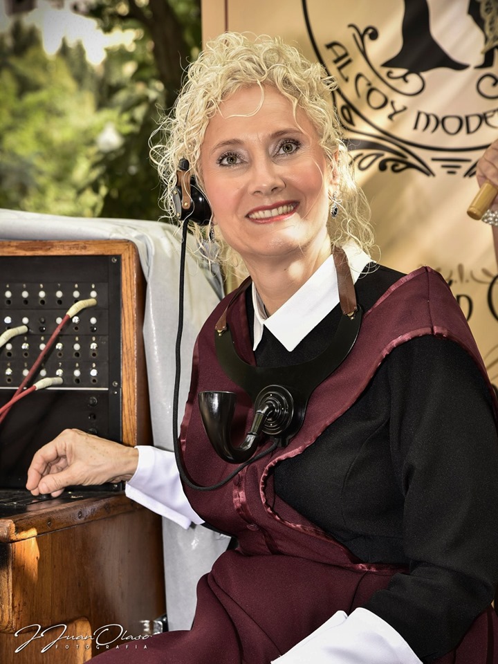 Siguiendo el rigor histórico que caracteriza a la Asociación Cultural Alcoy Modernista, un grupo de mujeres de la Asociación, compuesto por Inma, Loreto, Bea, Patricia, Verónica, Mila, Pepi, Carmen y Carolina… escogieron la indumentaria de las telefonistas, basándose en la prensa de la época, como por ejemplo el publicado en El Imparcial, de 1917, donde daba cuenta de la descripción de los uniformes de las telefonistas: