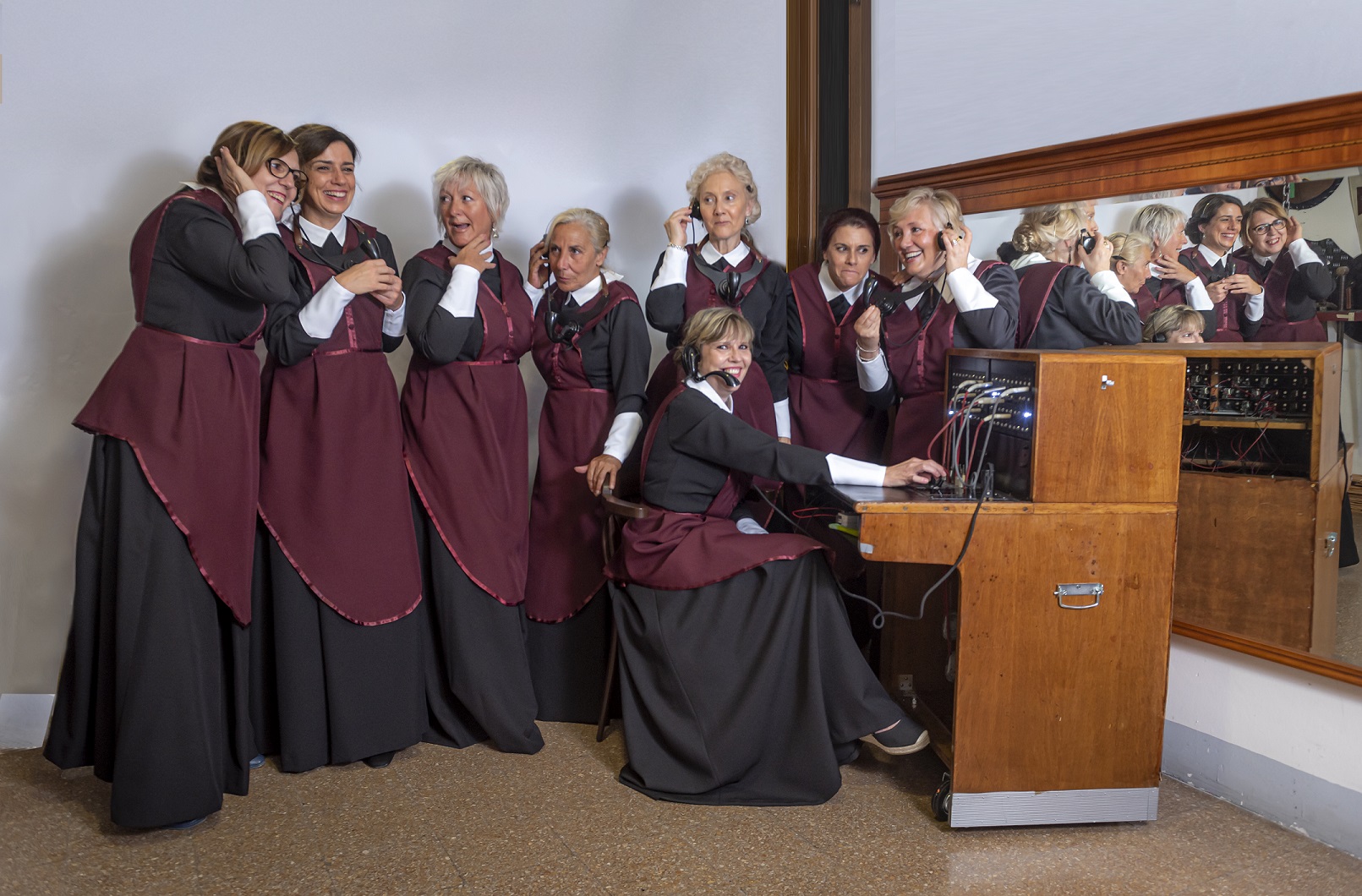 Mujeres de la Asociación Alcoy Modernista representando a un grupo de trabajadoras telefonistas hacia 1916. De pie Inma, Loreto, Bea, Patricia, Kika, Verónica, Mila y Pepi sentada en la imagen. Fotografía de Xavi Terol.
