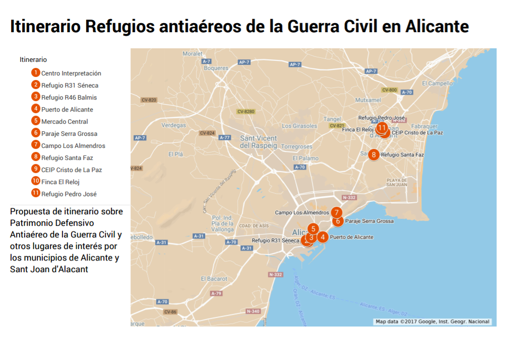 De los refugios alicantinos destacan las actuaciones museísticas realizadas sobre este patrimonio cultural en las ciudades como Alcoy (2006 y 2017), Alicante R31 Séneca y R46 Balmis (2015) y finalmente el refugio de la finca Pedro José en Sant Joan d’Alacant (Quiles y Martínez, 2016), que ha sido recientemente excavado y se encuentra en proceso de musealización.