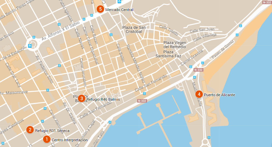 A finales de 2013 durante las obras en la Plaza Séneca se documentó uno de los refugios públicos con mayor capacidad, y que estuvo sellado durante muchas décadas, lo que permitió una actuación arqueológica de gran envergadura (Lumbreras y Lozano, 2015: 369). El refugio se encontraba en perfecto estado de conservación, y este hecho animó a que los gobernantes locales y autonómicos, decidieran recuperarlo y revalorizarlo, de forma que la plaza ganara en espacio y en servicios. Por un lado, la plaza fue transformada a pie de calle con un nuevo espacio social y por el otro, cultural, al recuperar el recinto subterráneo de un patrimonio olvidado, además de recuperar el inmueble de la Estación de Autobuses para otros usos. En otro lugar muy próximo a esta plaza, durante la realización de una obra, se localizó otro refugio en la Plaza Doctor Balmis (Lumbreras y Lozano, 2015: 387). Este presentaba un excelente estado de conservación, de modo que durante el 2014, tanto el refugio de Séneca, como el de Balmis, fueron rehabilitados por el consistorio como espacios museográficos.