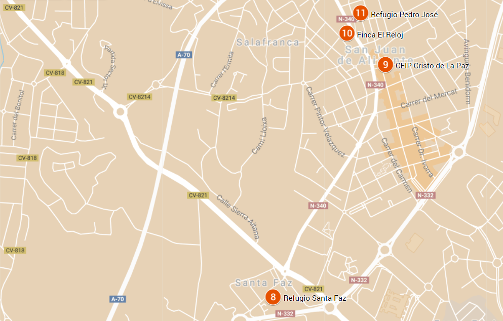 Volviendo al caso alicantino, además de los 92 refugios de los que se tiene constancia en la capital, se construyeron otros en localidades como Alcoy, Elche, Agost, Bussot, Castalla, Cocentaina, Denia, El Campello, Elda, Ibi, Jijona, Novelda, Onil, Orihuela, Sant Joan d’Alacant, Sant Vicent del Raspeig, Sax, Torrevieja, Villajoyosa, Villena y Jávea (Moreno, 2014: 5). Muchos alicantinos cogían el tranvía por la noche para pernoctar en las vecinas localidades, denominándose a este fenómeno como la “Columna del Miedo” (Moreno, 2014: 5).