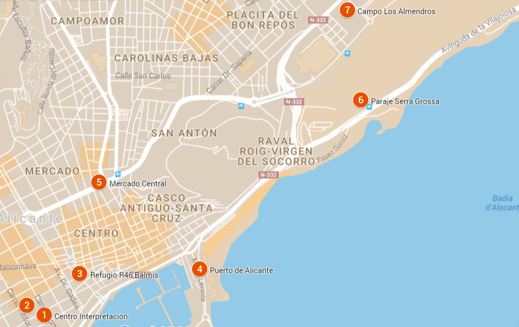 Al encontrarnos en la Costa Blanca, muchas veces el turismo que se atrae es exclusivo de sol y playa, por eso hemos planteado un Ruta sobre el patrimonio defensivo de la Guerra Civil entre ambas localidades con el fin de ofrecer un turismo alternativo. Algunas poblaciones de esta provincia cuentan con una entidad suficiente para atraer a turistas para ver su patrimonio, pero otros, en cambio, cuentan con atractivos puntuales. Es por ello que planteamos una Ruta que una Sant Joan d’Alacant con la capital y su puerto. La Ruta propuesta puede hacerse mediante el transporte público, de modo que se debe comenzar el TRAM en el MERCADO, dirección LÍNEA 3 y bajar en las paradas de SANGUETA y CAMPO DE GOLF, respectivamente. En esta última hacer transbordo en autobús con la línea 38, hacia la Avenida del hospital.