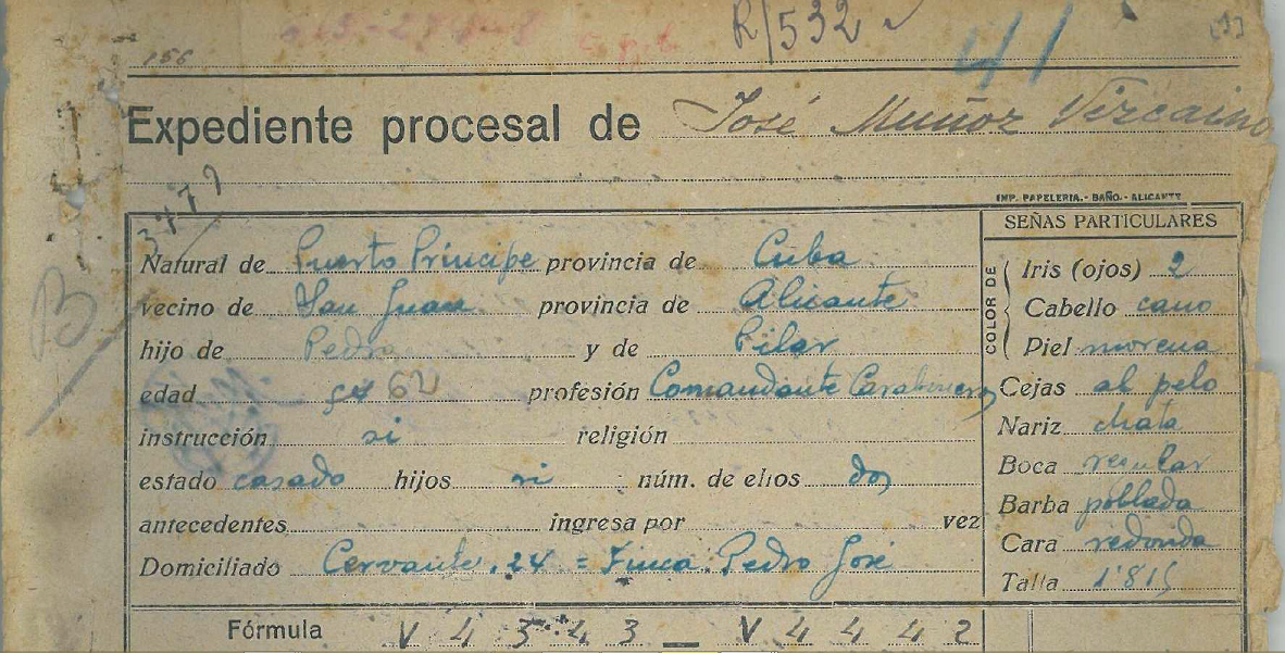 Expediente penitenciario de José Muñoz Vizcaíno, vecino de Sant Joan, domiciliado en la Finca Pedro Jose. Archivo Histórico Provincial de Alicante