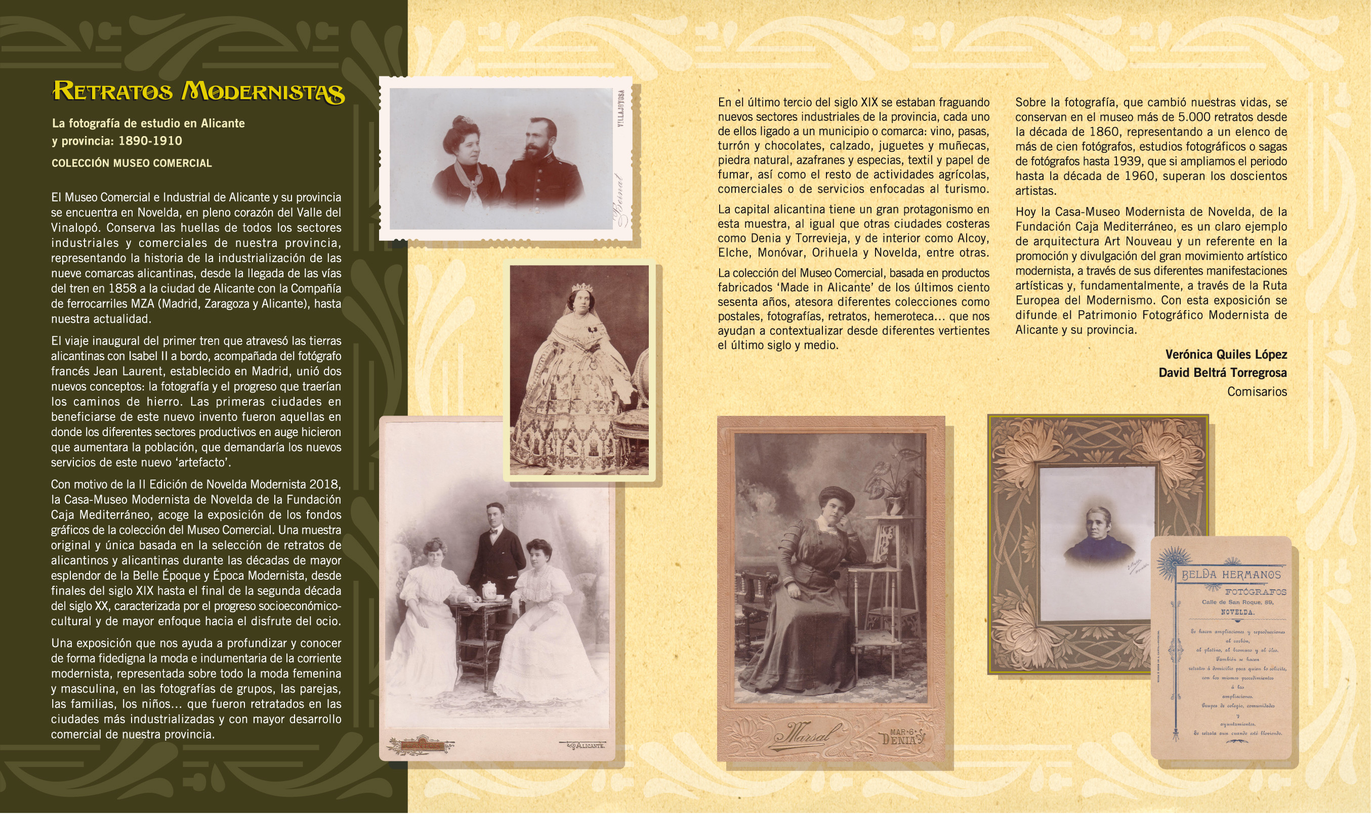 Con motivo de la II edición de Novelda Modernista 2018, la Casa Museo de Novelda acoge la exposición de los fondos gráficos de la colección del Museo Comercial. Una muestra original y única basada en la selección de retratos de alicantinos y alicantinas durante las décadas de mayor esplendor de la Belle Époque y Época Modernista, desde finales del siglo XIX hasta el final de la segunda década del siglo XX, caracterizada por el progreso socioeconómico-cultural y de mayor enfoque hacia el disfrute del ocio.