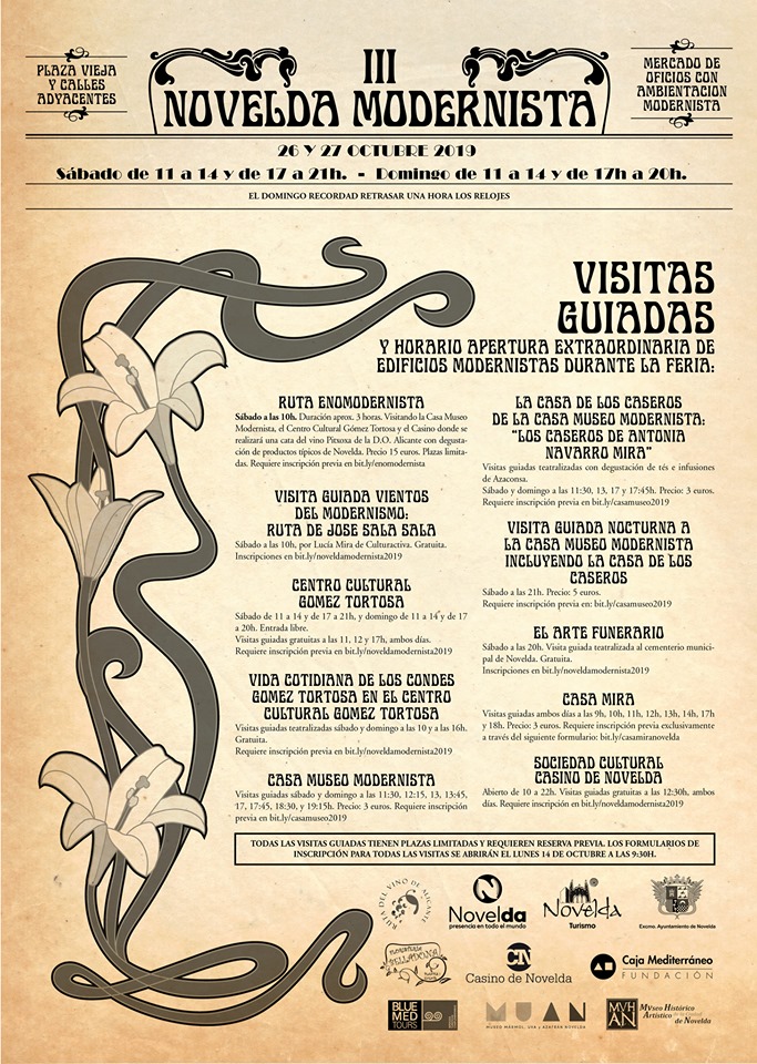 Las visitas guiadas y teatralizadas a los principales edificios modernistas de la localidad son uno de los puntos fuertes de la programación de Novelda Modernista, una propuesta de la concejalía de Turismo que se celebrará el fin de semana del 26 y 27 de octubre su tercera edición con el objetivo de poner en valor y dar a conocer el patrimonio modernista local.
