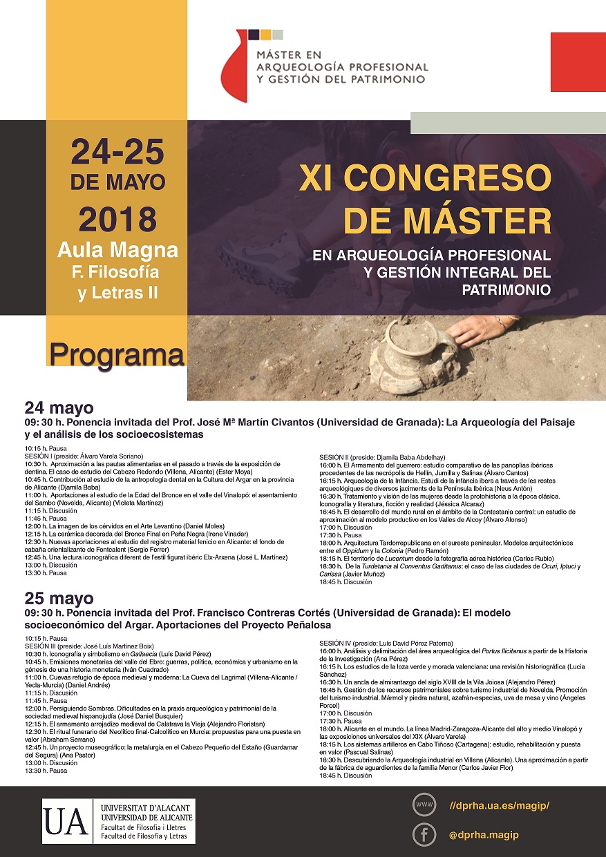 Nuestros alumnos en prácticas e investigadores Angie Porcel y Álvaro Varela y el resto del alumnado del Máster en Arqueología Profesional y Gestión Integral del Patrimonio de la Universidad de Alicante, ofrecerán una comunicación acerca de cada TFM.